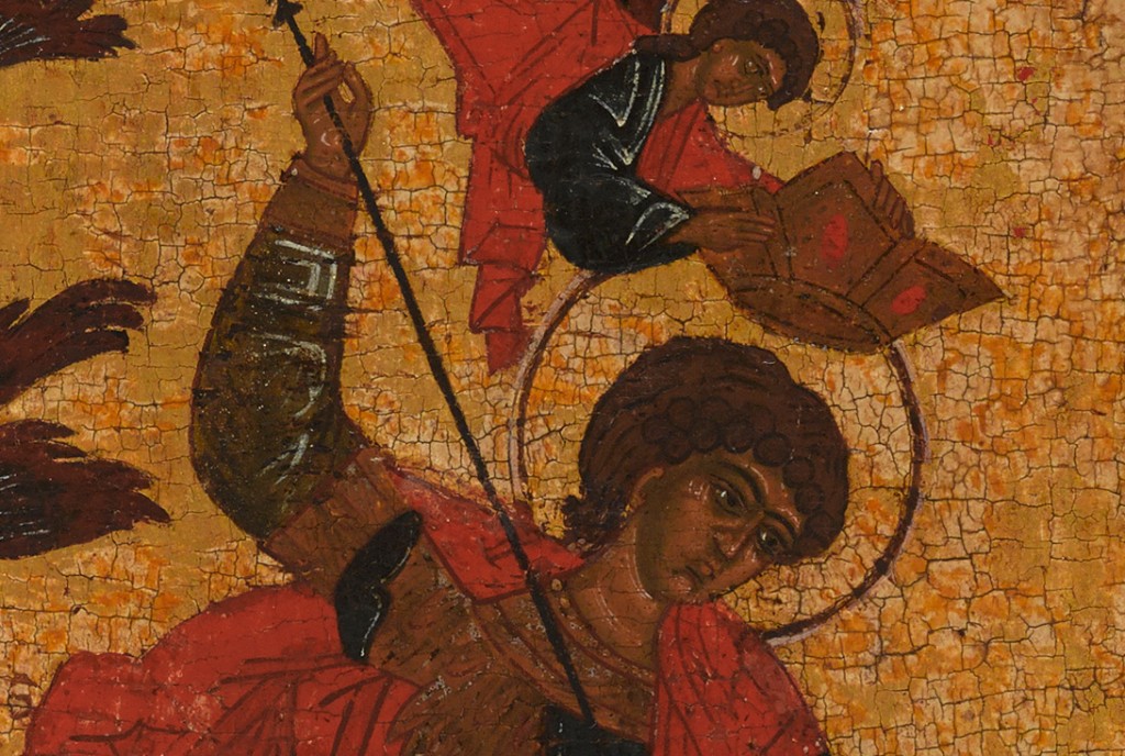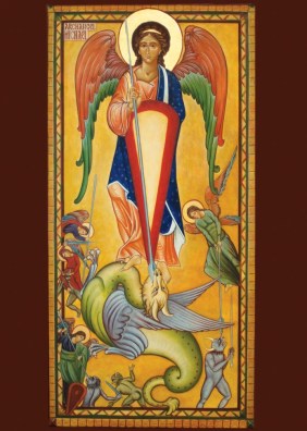 So here’s the first example. I saw the following image of St Michael and the devil, which is from an German early-gothic psalter. I decided to adapt it for a large scale work to go in Thomas More College chapel. The image I created is 6ft x 3ft and hangs high up on the wall behind the altar. The bottom of it is perhaps 10ft from the ground. I have deliberately made my composition less busy so that it will have an impact at a distance. In the development of the underlying line drawing I deliberately made the figures slightly more naturalistic in style, because I felt that these would connect with the contemporary viewer more easily. I looked to Greek style icons from the same period for inspiration here, especially in the drawing of St. Michael.