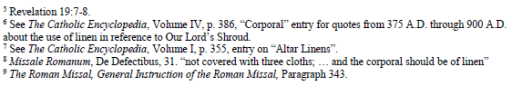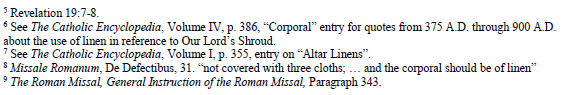 In the Old Testament, linen was used as one of the fabrics approved for use in the Temple. The priests’ holy garments were to be made from fine linen and not from wool or other material.(Footnote 2) After Christ, the tradition of using linen in the worship of God was continued, but with a new significance. All four Gospels record that Our Lord was wrapped in a linen cloth for burial. (Footnote 3) Since the essence of the Holy Sacrifice of the Mass is the re-presentation of the Sacrifice of Christ on Calvary (Footnote 4), it is significant that the only fabric which is associated with Jesus’ death is linen. In addition, linen is mentioned in Revelation as the “righteous deeds of the saints” which clothes the Bride of the Lamb, the Church. (Footnote 5) Throughout the history of the Church, writers have referenced these facts as the reasons for linen’s use in the Liturgy. (Footnote 6).