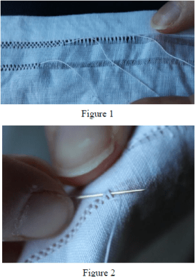 After this, I received permission to make a set of linens as a gift from our community for the ordination of a priest of our diocese. One aspect of our charism as Marian Sisters is to support our priests, especially in beautifying the celebration of the Sacred Liturgy, so this project was perfectly in concord with our life. From working in the sacristy and studying various linens, I noticed a beautiful way of stitching the hem to form a pattern in the threads along the edge. With little trial and error, I figured out a way of achieving this design on my linens. Once the hem is creased, the thread in the fabric that is directly above and parallel to the edge of the hem is pulled out. A few more threads above that one are pulled out of the fabric as well. (The number of pulled threads depends on the size of the linen and the size of the desired pattern.) This results in a very narrow strip of fabric that has nothing but perpendicular threads in relation to the hem. Then, the sides which do not have pulled threads are hemmed as usual, omitting the corners. The other hems with the pattern are finished by securing the hem and making the pattern at the same time. To do this, first, with the wrong side of the fabric facing up, one small stitch is taken in the topmost edge of the hem. The needle then separates a specific number of the perpendicular threads in the fabric, securely wraps around them twice, and returns to the hem. A very small stitch of the same number of threads as taken in the fabric is taken in the hem, and then the perpendicular threads are counted and wrapped again. This process continues until the end of the hem. The result is a border of bound fabric threads along the hem. If desired, this can become a double or triple row design by sewing a second time over the pattern, binding half of one set of bound threads with the half of the adjacent set of bound threads at a point above the initial pattern (see figures 1 and 2).