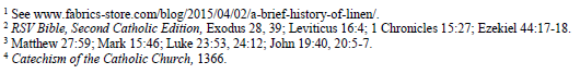 The invention and common use of artificial fabrics is relatively new in the history of the world, and materials such as rayon and polyester are very accessible and can be made into exquisitely beautiful fabrics. Even though Holy Mother Church has allowed for the use of other fabrics, the significance of linen as related to Christ’s Passion and its Scriptural basis should not be overlooked when choosing material to use for the Sacred Liturgy.